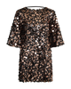 CM STREEPTE-TRAAN is een korte jurk in gaas verfraaid met grote pailletten. Bovendien heeft de jurk brede driekwart mouwen, een grote uitgesneden en riem aan de achterkant, evenals een zachte voering.