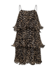 CMKIRA-jurk is een lange jurk in een prachtig, geplooid materiaal met een luipaardprint, ruches, smalle schouderbanden die aan de achterkant worden gebonden, evenals brede stroom die de jurk een elegante look geven.