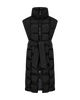 Cmnicco-Long-Taistcoat is een lange, gevlekte vest in een premium materiaal met een ritssluiting, een hoge kraag en een brede tie-string met een logo bij de taille.