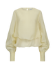CMTILLY-BLOUSE is a long-sleeve style in a semi-sheer woven fabric with a soft drape. Designed with a boxy silhouette, it features a extravagant layered ruffle effect at body hem. Voluminous gathered sleeves that taper into elongated cuffs with fabric-covered buttons, and a minimal neckline with a back keyhole. The body is double-layered while the sleeves remain unlined, creating an elegant transparency contrast.